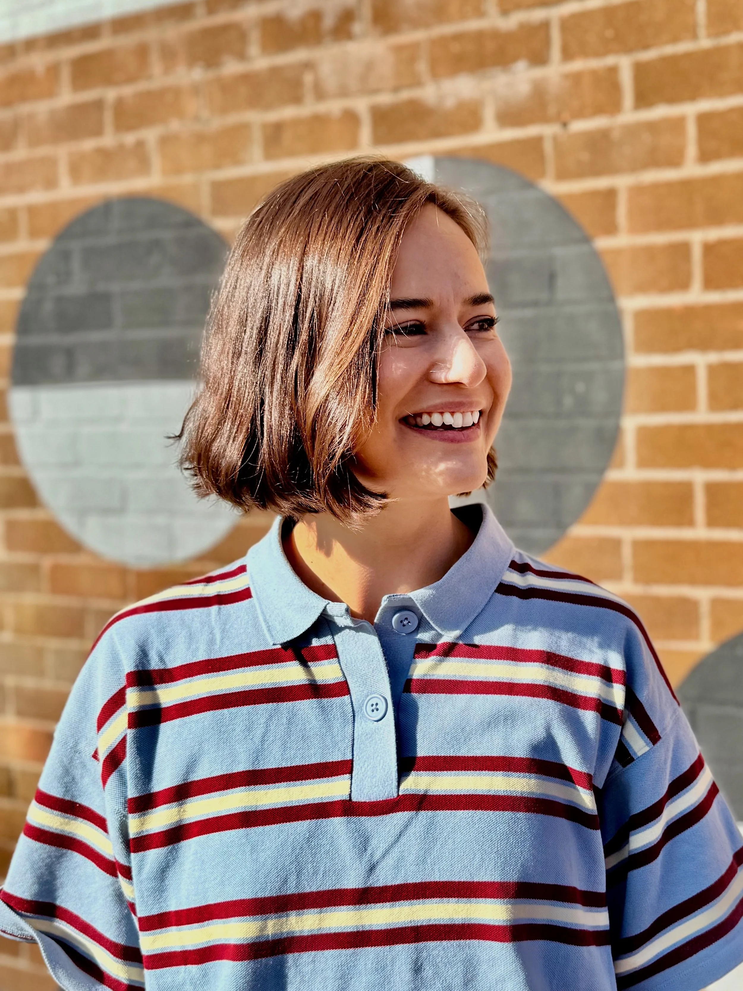 A woman with wavy light brown hair smiling and laughing, sitting on a blue stool in an indoor setting with a wooden bar in the background. She is wearing a light blue t-shirt and light jeans.